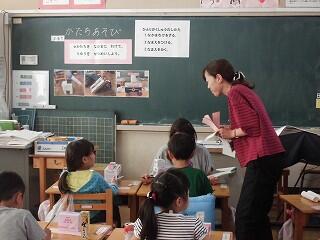 「かたちあそび」という単元で、身の回りにある箱や缶などを仲間に分けて、分けた理由を発表しました。『身の回りにある物の形の特徴や機能(転がる等 )を捉えて、仲間分けを考える』事が楽しみながらできていました。