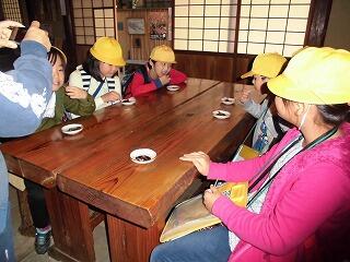 まずは油伝味噌です。昔からの伝統的の製法で味噌造りを行っている栃木市の老舗味噌屋さんです。味噌の造り方を丁寧に教えていただきました。子供たちは真剣に聞いたり質問したりしていました。