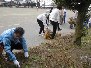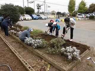 10日に引き続き、今回もホランティアの方に来ていただき、花壇の整備をしました。次回花を植えるために、土や肥料を入れて耕しました。次回は、いよいよ花を植えます。