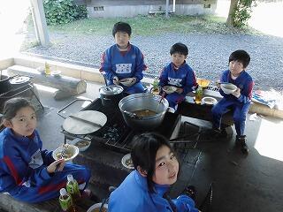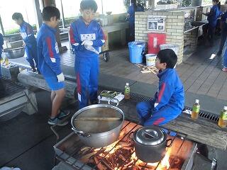 次に野外調理です。薪を割り、火をつけるところからがんばりました。みんなで協力して造った酒ご飯と漁師鍋はとてもおいしかったです。片付けは、「使う前よりきれいに」を合い言葉鍋をぴかぴかにしました。