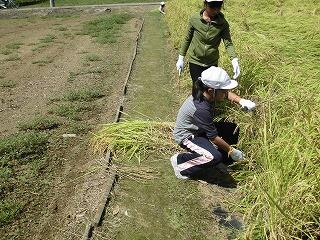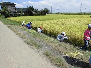 5月に植えた稲の苗が大きく成長し、頭を垂れ収穫の時期になりました。暑い中、往復の徒歩と稲刈りに参加し、農家の方は暑い中大変な作業をしているんだなと感じたようです。子供たちは、ほんの少し稲を刈っただけで、「暑い」「大変」という言葉を口にしていました。ご協力いただいた塚田さん。大変お世話になりました。