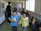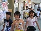 1年生と手をつないで、グループごとに学校の中を探検します。みんなにこにこ笑顔です。