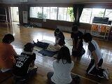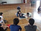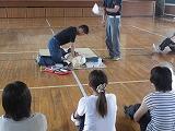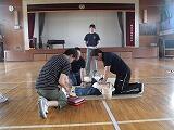 消防署の救急救命士の方から指導を受け、心臓マッサージのリレーをしながらAEDの装着をしたり、操作をしたりする演習と、緊急の措置の仕方についての留意点について講話をいただきました。参加した保護者の方も、汗をかきながら心臓マッサージやAEDの装着の演習に取り組みました。