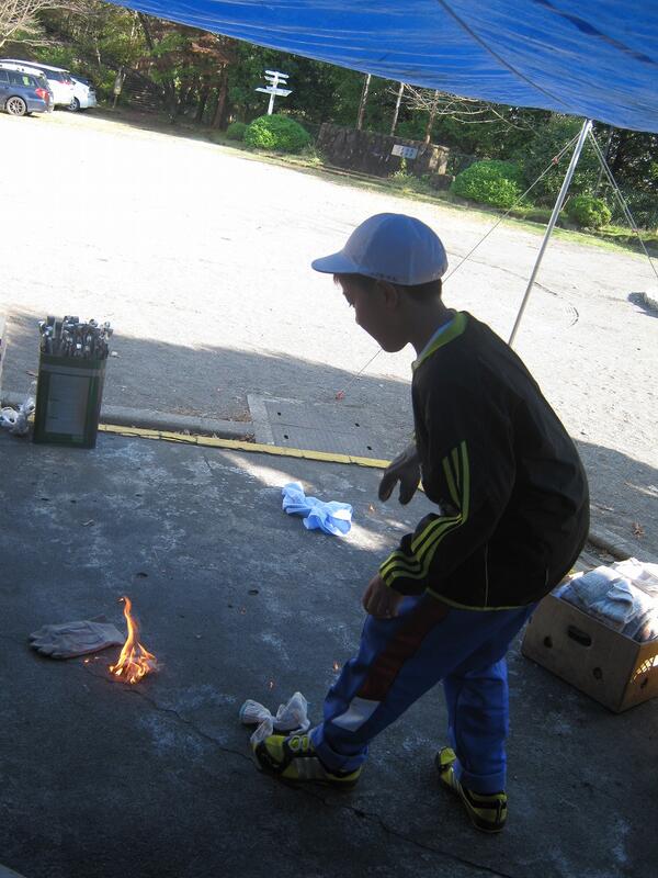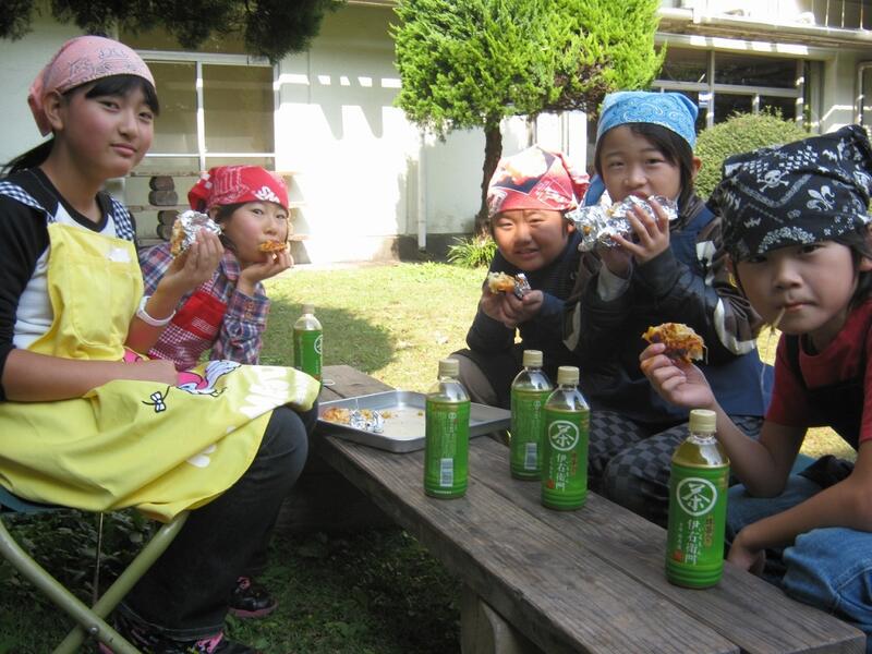 1日目は、午前中ハイキングで自然を満喫し、午後は、イリュージョン的な火おこしのあと、そのおこした火を利用して、自分の顔も真っ黒な杉板焼きを行いました。夜はキャンプファイヤー。各グループの出し物や先生方の出し物、マイムマイムなどで盛り上がりました。