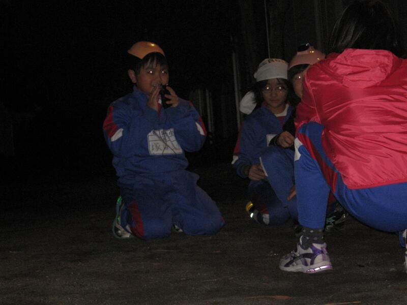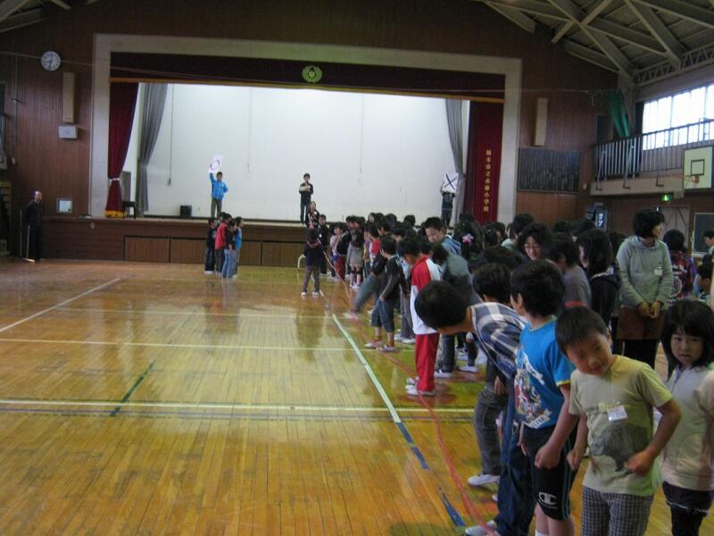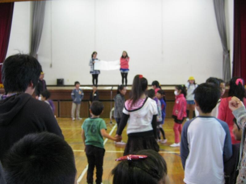 学校◎×クイズ        学校へ行こうゲーム     6年生に手を引かれ退場