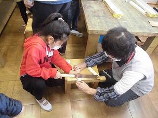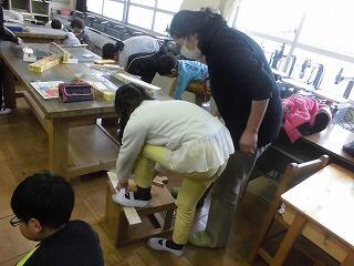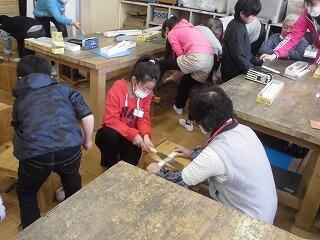 本日の5・6校時3年生が図工の時間にはじめてのこぎりを使いました。最初のうちはなかなか要領を得なかったようですが、ボランティアの方に手取り足取り教えてもらったおかげで、なんとか切ることができました。