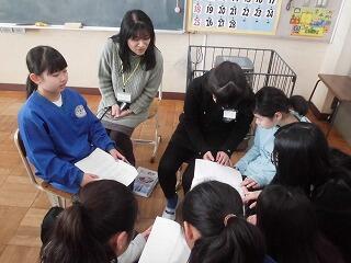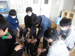 4つのグループに分かれ、いろいろな質問に答えてもらいました。自主学習帳や教科書、部活の道具などを見せてもらったり、実際にバッグを持たせてもらったりしました。中学校への不安が少し解消されたようです。