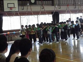 第二部は「ありがとう6年生の会」ということで、各学年から、6年生に感謝の気持ちを込めて出し物をしました。また、それに応えるように6年生から在校生へ合奏と合唱を行いました。どの学年も感謝の気持ちが込められていて、最後にコメントした校長先生は涙ぐんでいました。
