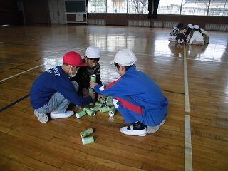本日昼休み、児童会が中心になって、チャレンジランキングを実施しました。今日のチャレンジは、空き缶積みです。3人1チームとなって競い合いました。優勝チームは、7つの缶を積み上げることができました。