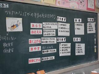 本日3校時に保健の学習で、「けがの防止」について勉強しました。今日は、養護教諭の小林先生が中心になり、担任の小川先生と二人で授業をしました。「すりきず」「きりきず」「鼻血」「つき指」「打ぼく」の五つのけがについて、どう対処すればよいか、実物を使いながら考えました。子供たちは、対処の仕方をよく理解し、今後の生活の中で、自分一人のときや下級生や友達にも正しく対処していきたいという思いを強くしたようです。