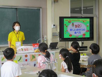 7月15日(金)、4年生が学級活動で「カルビースナックスクール」を行いました。普段何気なく食べているおやつの正しい食べ方について考え、実際の食生活を変えるために行動できるようにすることが目標です。カルビーの食育チームの方を講師として招き、パワーポイントやDVDでの説明や、本物のポテトチップス等を使ってのクイズやゲーム等を通して、自分の食生活について考えました。子どもたちからは「食べる時間や量に気を付けたい」「夏休みも今日の勉強を生かしておやつを食べたい」等の感想が出されました。