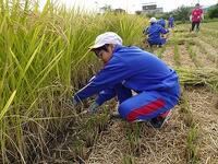 指を切らないように、逆手で稲を握ることを教えていただきました。