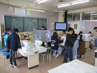 5年生の家庭科、エプロン作りがスタートしました!ミシンを使うのは初めての児童がほとんどです。今日は、ポケットの口の部分と、エプロン本体の胸の上の部分を縫いました。図工室でアイロンをかけた後は、家庭科室でミシンがけ。『安全に気を付けて縫う』ことがめあてです。製作は、ペアの友達と協力して一緒に進めます。「ここは三つ折りだよ。」「まち針の打ち方はね・・・」と、友達に教える言葉がたくさん聞かれました。
