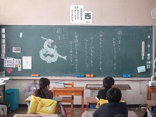 児童全員が無事に3学期をスタートできました。教室の黒板には、各担任が子供たちのために、思い思いのメッセージやイラストを描きました。