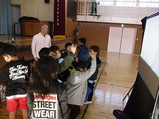 赤麻小の113回目の誕生日、12月4日の創立記念のお祝いで、今年は「演劇鑑賞会」を行いました。影絵劇団「打ち出の小づち」による「一寸法師」と「ブレーメンの音楽隊」の影絵劇を全校生で鑑賞しました。劇の途中で、一寸法師やロバ、ニワトリなどの影絵の道具を、希望した児童が実際に動かす場面では、大変盛り上がりました。本格的な影絵を見るのは初めての子が多く、自分の手で犬やうさぎなどの作り方を学び楽しみました。終了後は、順番に影絵のキャラクターの道具を手に持って動かすことができ、大満足の様子でした。