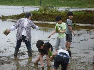 5月としては、涼しい日になってしまいましたが、5年生は元気いっぱいに田植えをしてきました。毎年お世話になっている1区の塚田さんの田んぼで今年も行われました。田植えの準備から田植えの指導まで、塚田さんには大変お世話になりました。ほとんどの子どもが田植え初体験ということもあり、裸足で田んぼに入るとひときわ大きな歓声を上げていました。
