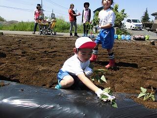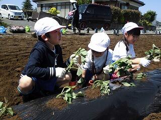少し汗ばむ陽気でしたが、1・2年生のこどもたちは元気いっぱいにサツマイモの苗を植えました。畝づくりからマルチ掛けまで、地域ボランティアの方と1・2年生の保護者、合わせて20名以上の方にご協力いただきました。本当にありがとうございました。
