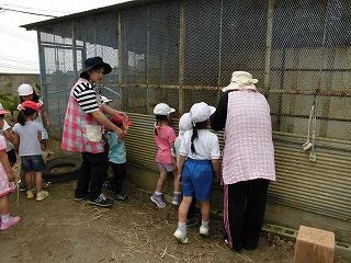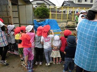 ハートランド保育園の子どもたちが、うさぎを見に来ました。うさぎ小屋をのぞいていたところ、
