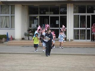 飼育委員さんが、えさをあげに、小屋のドアを開けてくれました。うさぎが元気に小屋の外で動き回る様子も見ることができました。「かわいい!」と歓声を上げる子もいました。