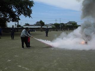 大きな地震が発生し、家庭科室から出火した想定で防災訓練を実施しました。まずは地震から身を守るために机の下にもぐりました。その後、火災が発生し校庭へ避難しました。避難開始から全校生の人員を確認するまで3分かかりませんでした。みんな真剣に訓練できました。次に、消火訓練を行いました。先生3人が実際に火を消してみました。炎が大きく火を消すことの難しさを感じました。火の取り扱いには十分気を付けなくてはなりません。
