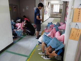 本日2校時の終了前に、竜巻が発生したという想定で避難訓練を実施しました。防災頭巾をかぶり、窓がなるべくないところに学年別に集まり、竜巻が通り過ぎるまで身を低くして避難していました。実施後、もっと避難時間が短く、安全な場所はないか、職員でも検討しました。もちろん起こらないことが一番ですが、もしものとき被害を最小限に食い止めることができるように、改善していきたいと思います。