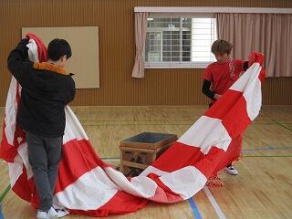 赤麻小の体育館はまだ新しくてきれいですが、残念ながら器具庫がありません。そこで、体育館の玄関を封鎖し、その中に、跳び箱や踏み切り板などを、積み重ねてみんなで力を合わせて片付けました。また、平均台やボールなどは、校舎の一番東側にある学習室まで、5年生が責任をもって最後まで一生懸命運びました。4年生は、体育館に飾ってあった花や輪飾りを、丁寧に片付けていました。