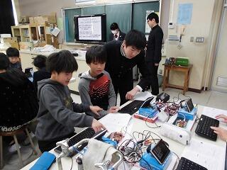 栃木工業で開発した「こどもぱそこん スカイベリージャム」を使って、6年生一人一人が、コマンドとプログラムについて、熱心に学習しました。LEDライトを付けたり消したり、点滅させたりと、自分でコマンド(命令 )し、実行させるという、基礎的な学習を通し、プログラミングに大変興味をもったようです。高校生が親切に教えてくださることで、6年生も理解を深めることができるし、高校生も自分達の技術に自信をもてる、とても良い取組だと感じました。