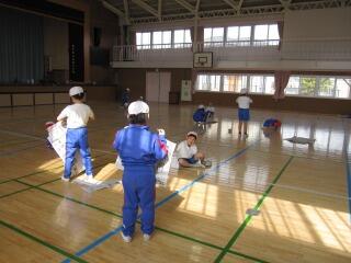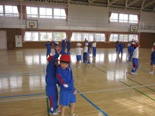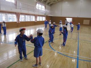 まず、最初はペアになってリズムダンスをしました。初めてのダンスでしたが、子供たちはすぐに覚え、体を大きく動かして踊っていました。いろいろな友達とペアになって楽しく活動していました。たくさん動いて息を切らしていた人もいました驚く・ビックリ
