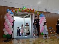 赤麻小の地域ボランティアのコーディネーターさんが作ってくださった、カラフルでステキなバルーンのアーチを、新入生がくぐり入場しました。