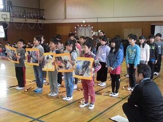 まず、ボランティアの様子の写真をパウチしたプレゼントを代表して6年生が手渡ししました。