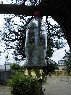 今年は、赤麻小でも蜂が多いです。今年も蜂のトラップを仕掛けました。築山の上の松と塀沿いの八重桜、アオギリに仕掛けました。子供たちが行けないところですが、近づかないように気をつけてください。