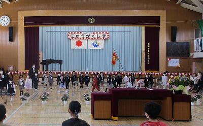 26名の新入生が元気に入学                             4月9日(金)、令和3年度の入学式が行われ、26名の新入生が元気に式に参加しました。今年度も新型コロナウィルス感染拡大防止のため、来賓はPTA会長(令和2年度)の髙際英俊様だけでしたが、新入生保護者様、関係職員、6年生児童とともに、新入生の入学をお祝いすることができました。新入生呼名では一人一人がしっかりと返事をし、最後まできちんと参加できていました。とても素晴らしかったです。11日(月)からは登校班での登校となりますが、元気に登校してきてもらいたいと思います。小学校での学習や生活が1年生にとって楽しいものとなり、喜んで登校できるよう、職員も上級生も、これからもみんなで応援していきたいと思います。