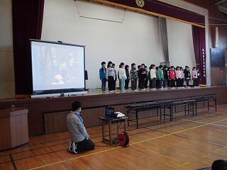 あかまっ子タイムに1年生の表現活動を行いました。上級生はもちろん、保護者の方々、学校評議員の方々の前で、堂々と発表することができました。入学してもうすぐ1年。いろいろなことができるようになりました。できるようになった合唱や合奏、詩の朗読などを発表しました。また、1年間にあったいろいろな出来事を画像を見せながら大きな声で発表しました。