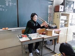 本日2校時、音楽の時間に雅楽で使う笙(しょう)という楽器を体験しました。講師は、小山市の間々田に住んでいらっしゃる大巴さんを講師に迎え、演奏を聴いたり、触らせていただいたりしました。最後は、大巴さんの笙と子供たちのけんばんで曲をあわせました。