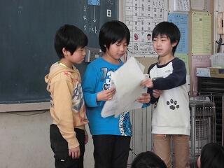 3月8日、千葉さん・清水さんが来校し、図書委員から日頃の支援に対する感謝のしるしとして、児童からの手紙を渡しました。