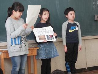 昨日の3月9日、3年生が総合的な学習の時間に取り組んできたことをまとめ、発表会をしました。3年生は、「藤岡地区をさぐろう」というテーマで、ふるさと藤岡に対する見識を広め、ふるさとを愛する気持ちがもてるように様々な取組をしていました。校外学習でまわったところを中心に、遊水地を詳しく調べるグループ、道の駅「みかも」を調べるグループ、歴史民俗資料館を調べるグループなど、同じ興味関心をもった友達とグループを組み、詳しく調べ、画用紙にまとめていました。また、発表では、聞いている人が興味をもって話を聞き、理解しやすいようにクイズ形式を取り入れながら、分かりやすい発表に努めていました。