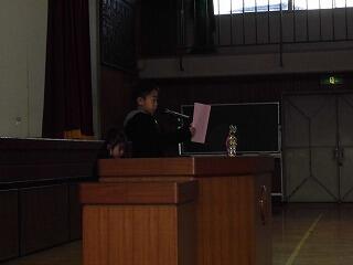 次に代表児童による作文の発表がありました。餅つきなど伝統行事に参加したり、貴重な体験をしたりした思い出や算数や縄跳びを頑張りたいというめあてをしっかり発表することができました。