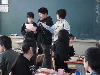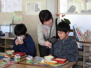 今日の給食の時間、FMくららと栃木ケーブルテレビが取材に来ました。今日の給食のメニューは、赤麻小の6年生が考えたメニューです。メニューのテーマは、「体も 心も 温まる 和食」です。ご飯、牛乳、鮭の塩焼き、おかか和え、豚汁、オレンジです。
