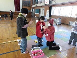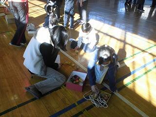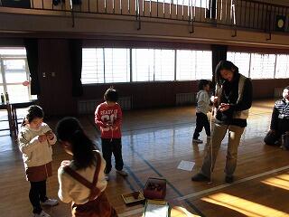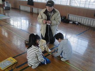 今日の2・3校時に、1年生が昔遊びをしました。1年生のおじいさんおばあさんや地域ボランティアの方々に教えてもらいながら、「輪投げ」「けん玉」「メンコ」「コマ回し」「なわとび」「竹とんぼ」「羽子板」「ベーゴマ」「ヨーヨー」「お手玉」「おはじき」「あやとり」で遊びました。なかなか難しいようでしたけれど、子供はコツをつかむのが早く上手にできるようになったものもありました。