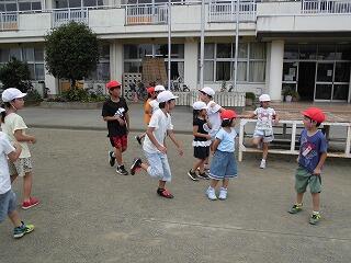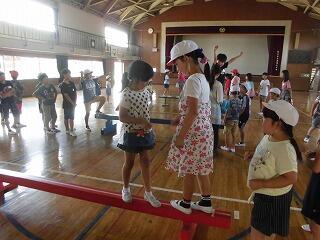 運動委員会の企画で、体育教室が昼休みに体育館で行われました。1年生対6年生、2年生対3年生対抗で平均台じゃんけんを行いました。勝って喜び、負けて悔しがり暑さに負けずに活動できました。