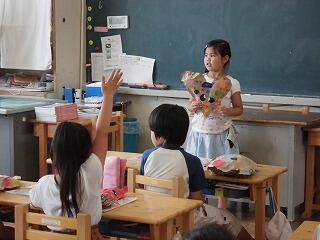 一人ずつ作品の発表をしていました。発表を聞いている児童は、「形がとてもかわいいですね。」「色使いを工夫していますね。」等、作品の感想をしっかり言っていました。挙手の仕方も上手です。