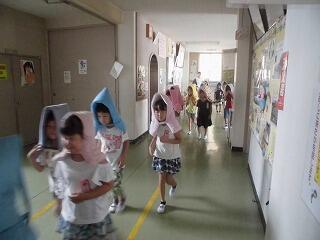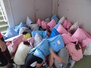 本日2時間目、竜巻を想定した避難訓練を行いました。防災頭巾をかぶり、校舎の壁際(各学年の避難場所)に、なるべく小さい塊になってかがむ、という訓練を行いました。