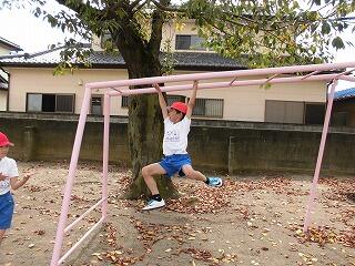 鉄棒で逆上がり、タイヤ跳び、雲梯の3種目をやりました。逆上がりは、もう少しでできそうな子がたくさんいます。タイヤ跳びは、全員上手です。雲梯は、なかなか手が前に出ず、ぶら下がったままの子もいますが、楽しく遊びながら、上手になってくれるといいなと思います。どの子もあきらめずに、果敢にチャレンジしている姿が、すばらしいです。