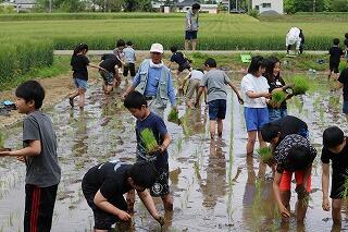 今年も五年生が、1区の塚田さんの田んぼをお借りして、塚田さんの指導のもと田植えを体験しました。天候もよく、裸足で田んぼに入っての田植えは気持ちよかったようです。塚田さんありがとうございます。