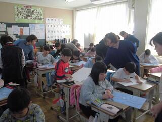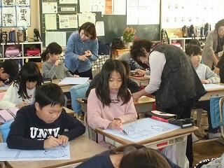 4年生が彫刻刀を使って木版画を制作しています。たくさんのボランティアさんが子どもたちの指導に来てくださいました。4年生は、一言もしゃべらず、黙々と作業をしていました。完成が楽しみです。
