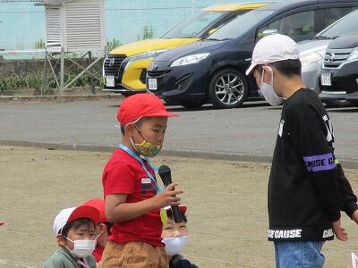 今年は実施できました!「1年生を迎える会」 5月12日(水)、「1年生を迎える会」が行われました。集会活動を通して1年生と上級生が交流し、今後1年生が楽しく学校生活を送れるようにすることがねらいです。昨年は臨時休校で実施できませんでしたが、今年は無事実施することができました。企画委員会の6年生の司会進行により、1年生へのインタビュー(名前と好きな物)、縦割り清掃班による遊び(感染防止対策がとれる遊び)、1年生へのプレゼントなどが行われました。1年生は全員がインタビューに答え、名前や好きな物を発表することができました。終了後の感想も「楽しかった」