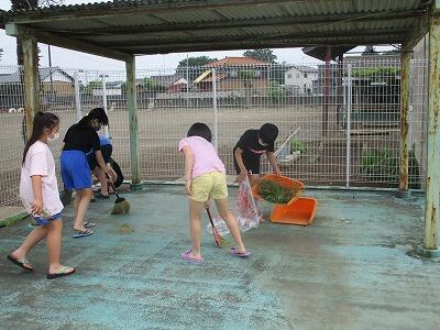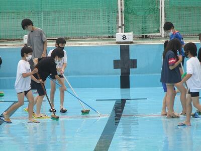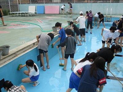 プール清掃を実施 5月20日(木)、5年生と6年生によりプール清掃が行われました。今年も新型コロナウィルス感染防止に十分気を付けながら、水泳学習を実施します。5月26日(水)のプール開きに向けて、5,6年生、そして先生方も一緒に頑張り、プールをきれいにしてくれました。また、1年生から4年生も校庭の除草や石拾いをしました。この日は18日(火)から延期された新体力テストを全学年1,2校時に行っていたので、子どもたちは相当疲れていたと思いますが、けがもなく、無事終了することができました。おかげで、今年も楽しい水泳学習ができることと思います。