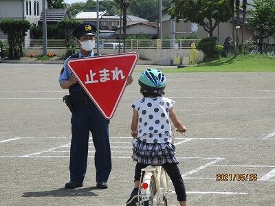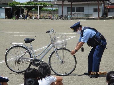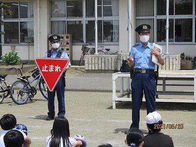 中、高学年の交通安全教室を実施 4月に行われた低学年の交通安全教室に続き、5月26日(水)に中、高学年の交通安全教室が行われ、今年度の交通安全教室が終わりました。2校時に3,4年生、3校時に5,6年生が行いました。「自転車の発進・停止・走行について必要なことを知り、自転車を安全に利用できるようにすること」が中学年、「乗車に必要な決まりを知り、自転車の安全な利用を工夫すること」が高学年のねらいです。講師として、前回に続いて赤麻駐在所の柴村様に、さらに今回は藤岡交番、栃木警察署の方々にも来ていただきました。内容は自転車の正しい乗り方、点検の仕方の説明やクイズ、校庭の模擬道路での実践練習でした。交差点の渡り方が分からずに苦戦する姿も見られましたが、実物の道路標識を持ち込んでの説明や、実際に自転車に乗っての練習を通して、自転車の正しい乗り方、安全な乗り方について学ぶことができました。