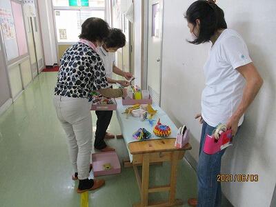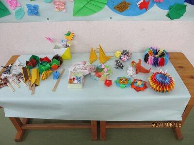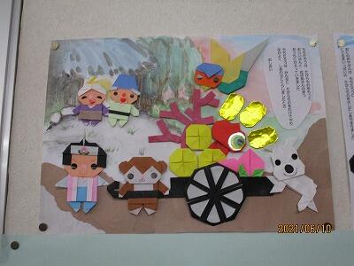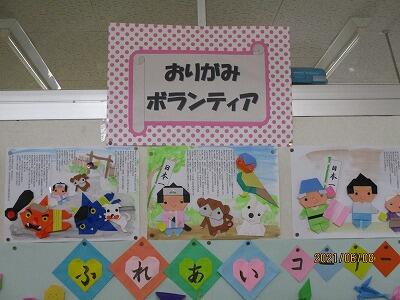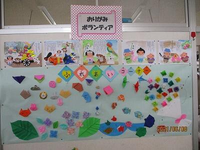 ボランティアさんが折り紙コーナーを設置                                今年度もコロナの影響で子どもたちに直接接する学習ボランティアがなかなかお願いできない状況ですが、そのような中でも、登下校の見守り、読み聞かせ、昼休みの見守り、サツマイモの苗植え、花壇の整備等、既にたくさんのボランティアさんにお世話になっています。   今年は新たにボランティアさんに掲示コーナーの一角(保健室前の掲示コーナー)を担当していただくことになりました。現在、写真のような「折り紙コーナー」が設置されています。なかなか見られないような複雑な折り方の作品や子どもたちの作品の他、折り紙で登場人物を作った「ももたろう」の物語も掲示されています。子どもたちもこのコーナーの前を通る時には興味深く見たり触れたりして、楽しんでいます。様々な才能や趣味をお持ちのボランティアの皆様が作る、今後の掲示コーナーが楽しみです。