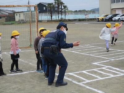 1、2年生が交通安全教室を実施                                   4月14日(木)、1、2年生が交通安全教室を行いました。「道路の歩行及び安全な横断の仕方について知り、守れるようにする」ことがねらいです。昨年に続き、今年も赤麻駐在所の方を講師としてお招きしました。まず、クイズ形式で信号での左右確認の大切さや、防犯のために大切な「いかのおすし」について確認した後、校庭に描かれた模擬道路で実際に横断歩道を横断したり道路を歩いたりして、交通ルールや横断の仕方を学びました。道路の途中にはパトカーを停車させたり、その他の障害物を置いたりして、様々な場面での安全の確認の仕方や歩行の仕方を学びました。1年間無事故で過ごせるよう、学校でも日常的に指導していきますので、保護者の皆様、地域の皆様のご協力、今年もよろしくお願いします。